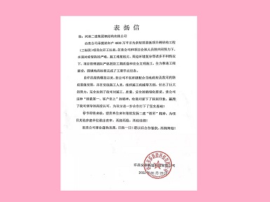 許昌安彩新能科技有限公司向河南二建集團(tuán)鋼結(jié)構(gòu)有限公司發(fā)來表揚(yáng)信