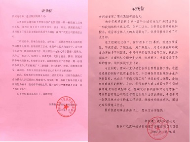 新鄉(xiāng)建工建設(shè)有限公司和河南新飛智家科技有限公司向河南二建集團(tuán)鋼結(jié)構(gòu)有限公司發(fā)來表揚(yáng)信