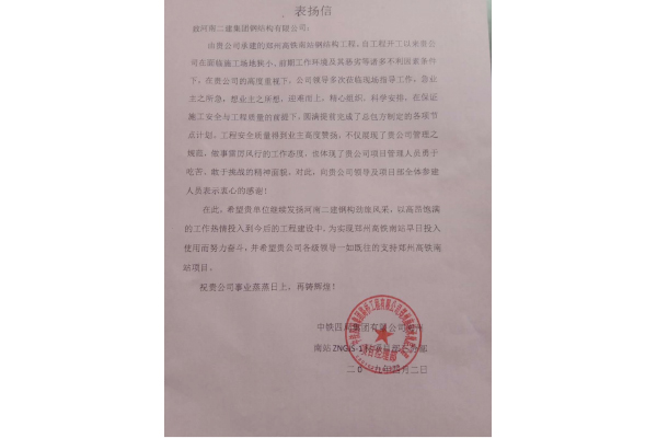 鄭州高鐵南站項目總包方向公司 發(fā)來表揚信