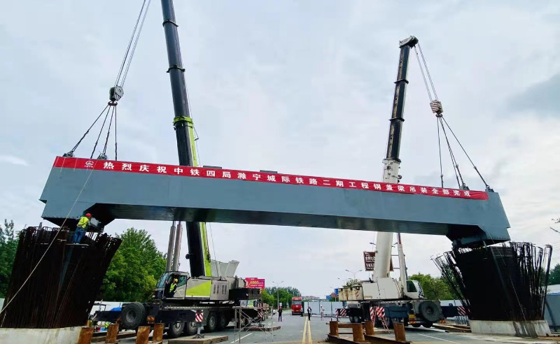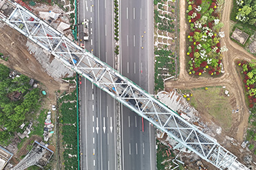 ?該工程跨蘭南高速,全線鋼箱梁吊裝跨度最大為88米。